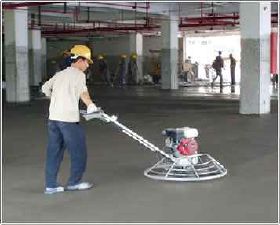 布钢筋网 、混凝土浇注 、混凝土层整平收光、第一次干撒粉料、提浆、第二次干撒粉料、机械收光、磨光、人工抹平边角、养护