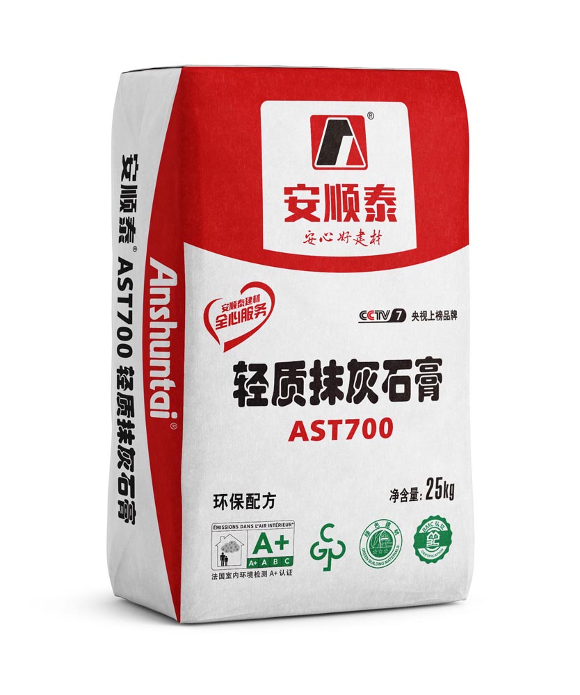 安顺泰AST700轻质抹灰石膏采用优质脱落石膏、闭孔玻珠、进口添加剂等材料,经工厂化预拌而成的石膏基类轻质成品抹灰砂浆,特别适用于机施喷涂、毛细管网系统、建筑物室内墙、顶面砼、砖、轻质砌块基层表面的找平粉刷。产品具有:绿色环保、轻质、隔音、保温、防火、调节室内湿度、改善居住舒适度等功能。本产品通过法国A+室内环境质量认证等多项环保认证,是绿色环保产品。