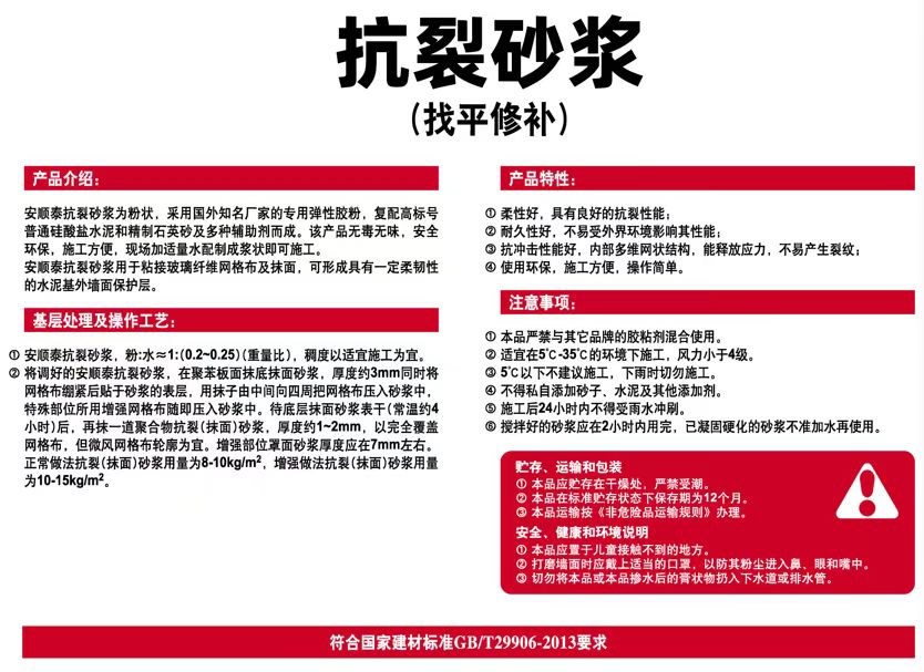 安顺泰抗裂砂浆用于粘接玻璃纤维网格布及抹面,可形成具有一定柔韧性的水泥基外墙面保护层。